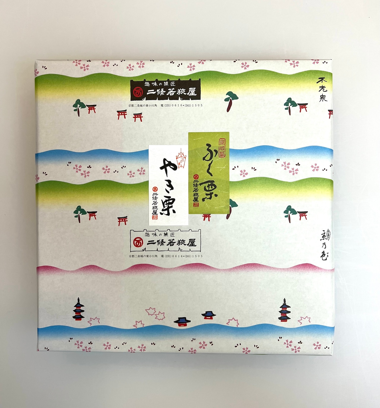 厳選した大粒の栗をまるごと栗餡とこし餡で包み羊羹がけした「ふく栗」と、栗餡で包みこんがりと焼き上げた「やき栗」の詰め合わせ。