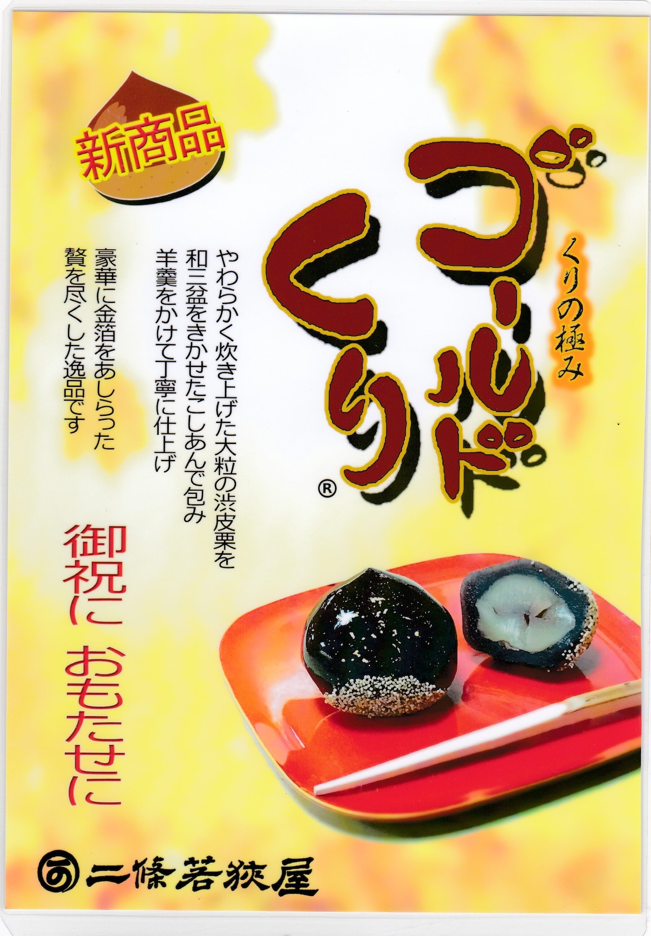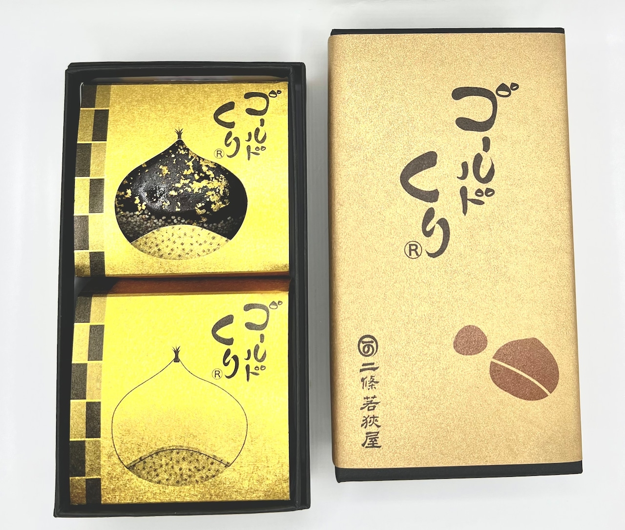やわらかく炊き上げた大粒の渋皮つきの栗をまるごと和三盆糖をきかせたこし餡で包み羊羹をかけて丁寧に仕上げ、豪華に金箔をあしらった、贅を尽くした逸品です。