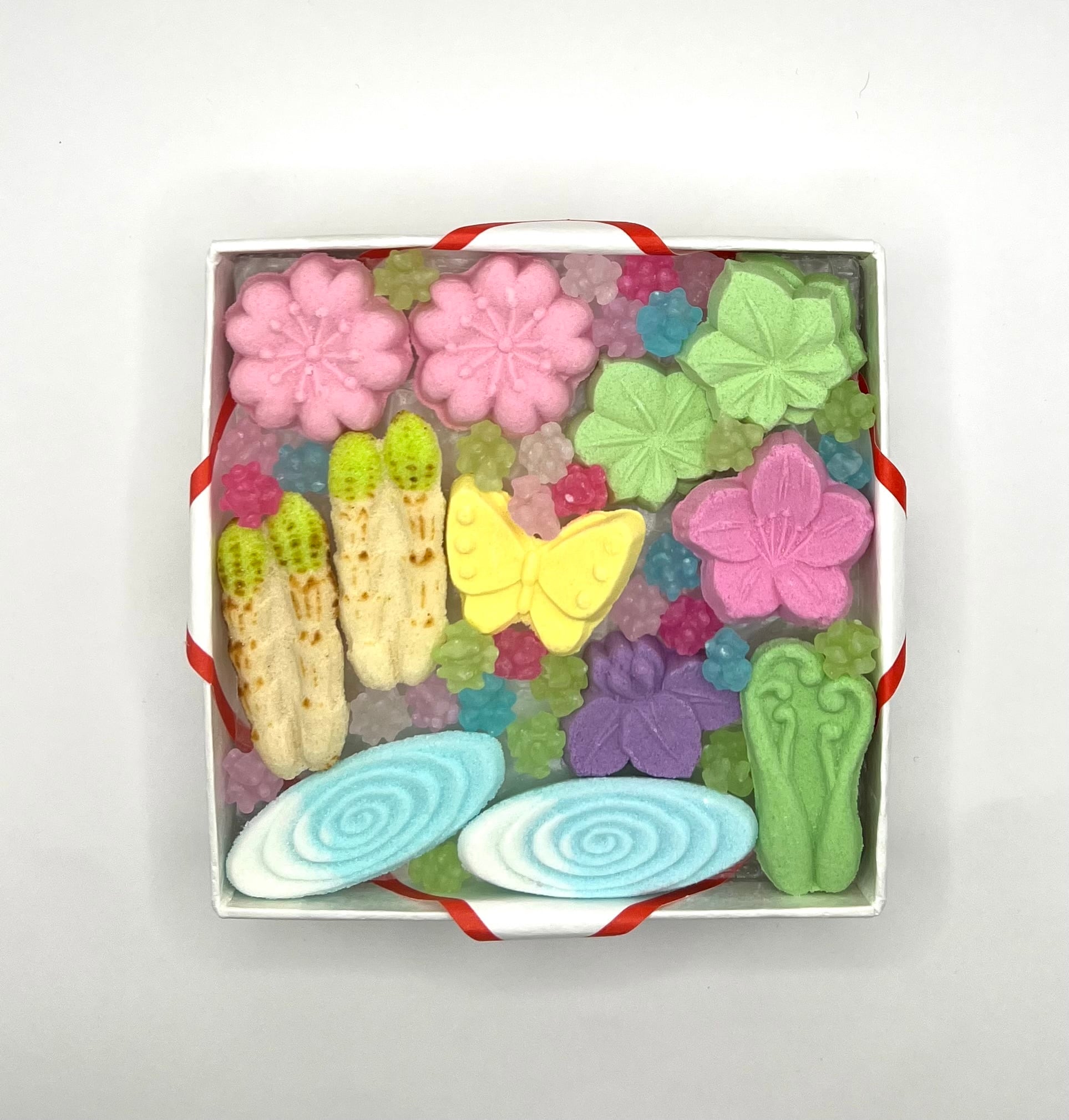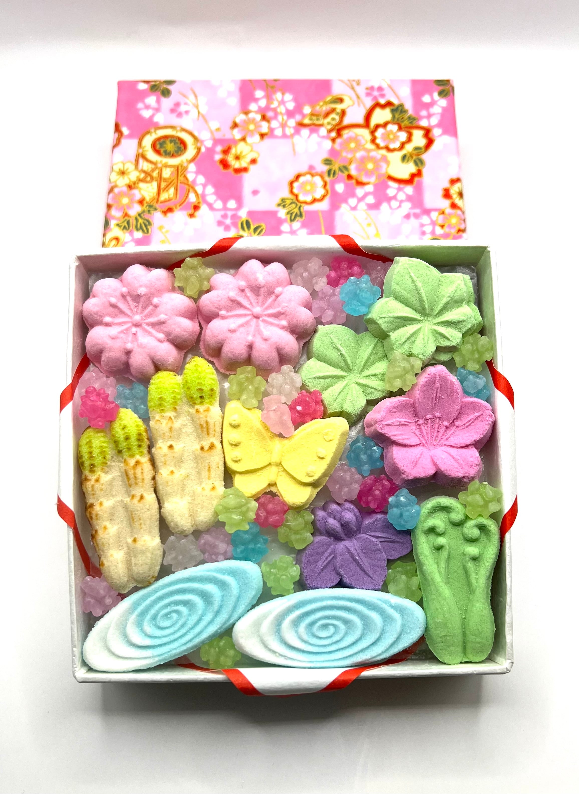 和三盆糖を使い型押しした干菓子の詰め合わせ。