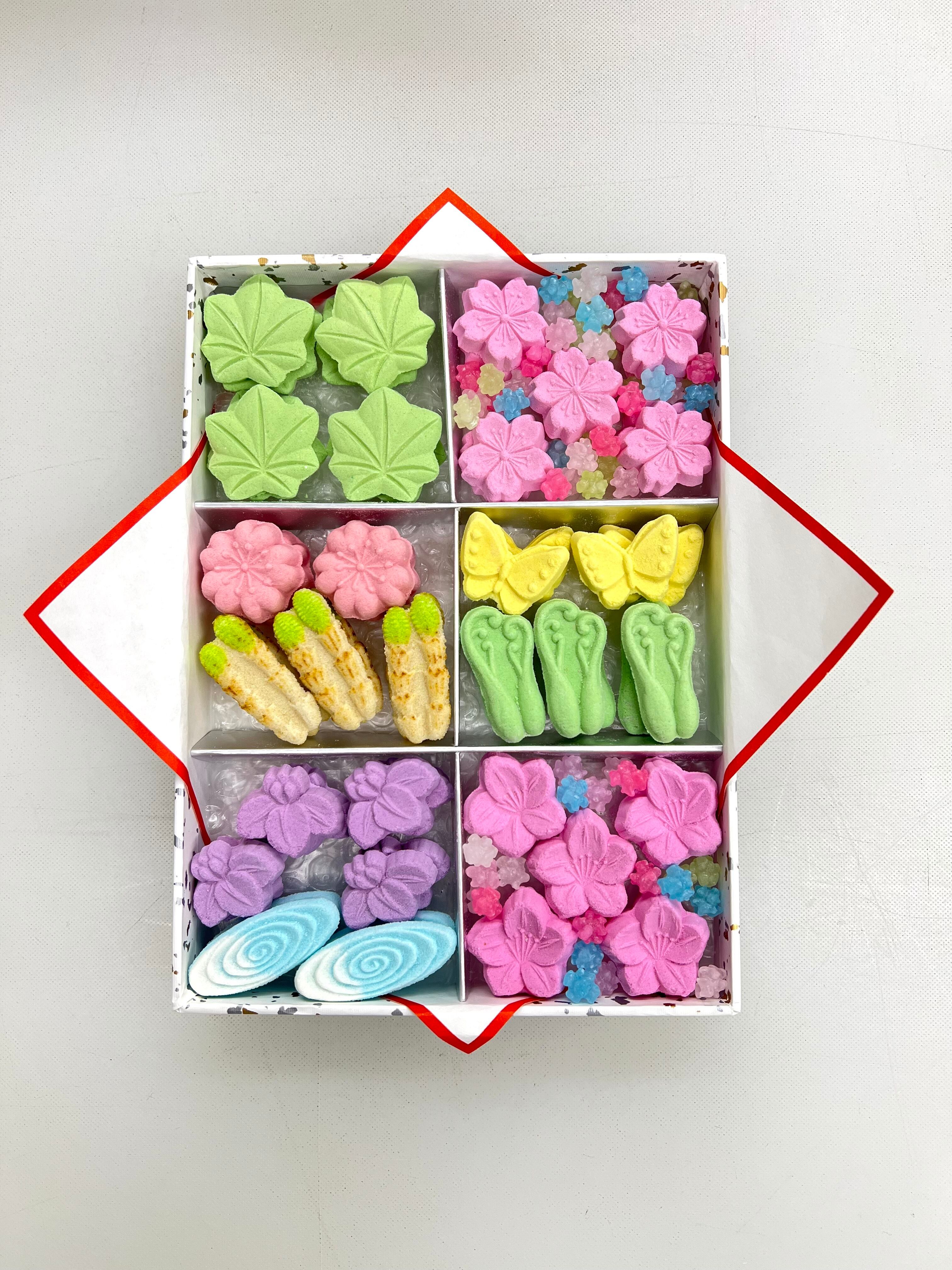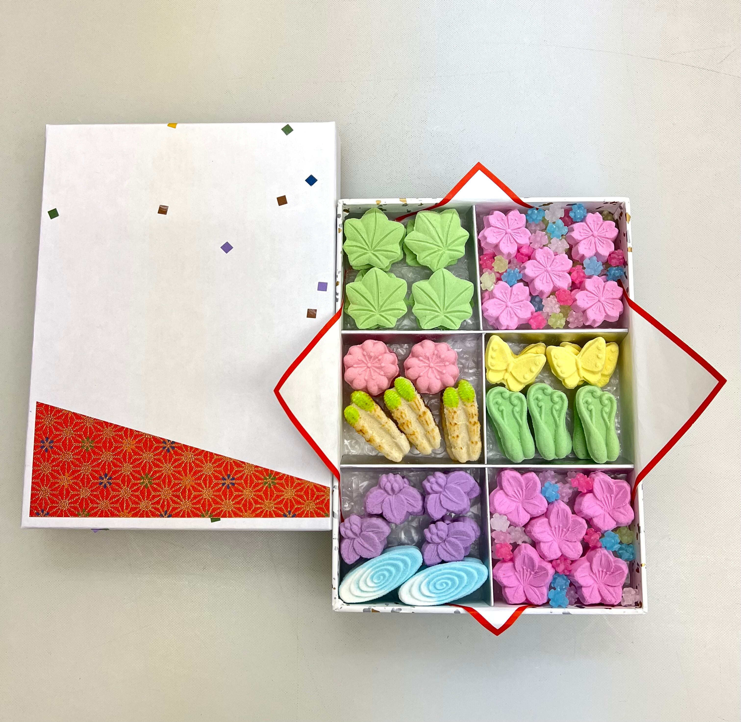 和三盆糖を使い型押しした干菓子の詰め合わせ。