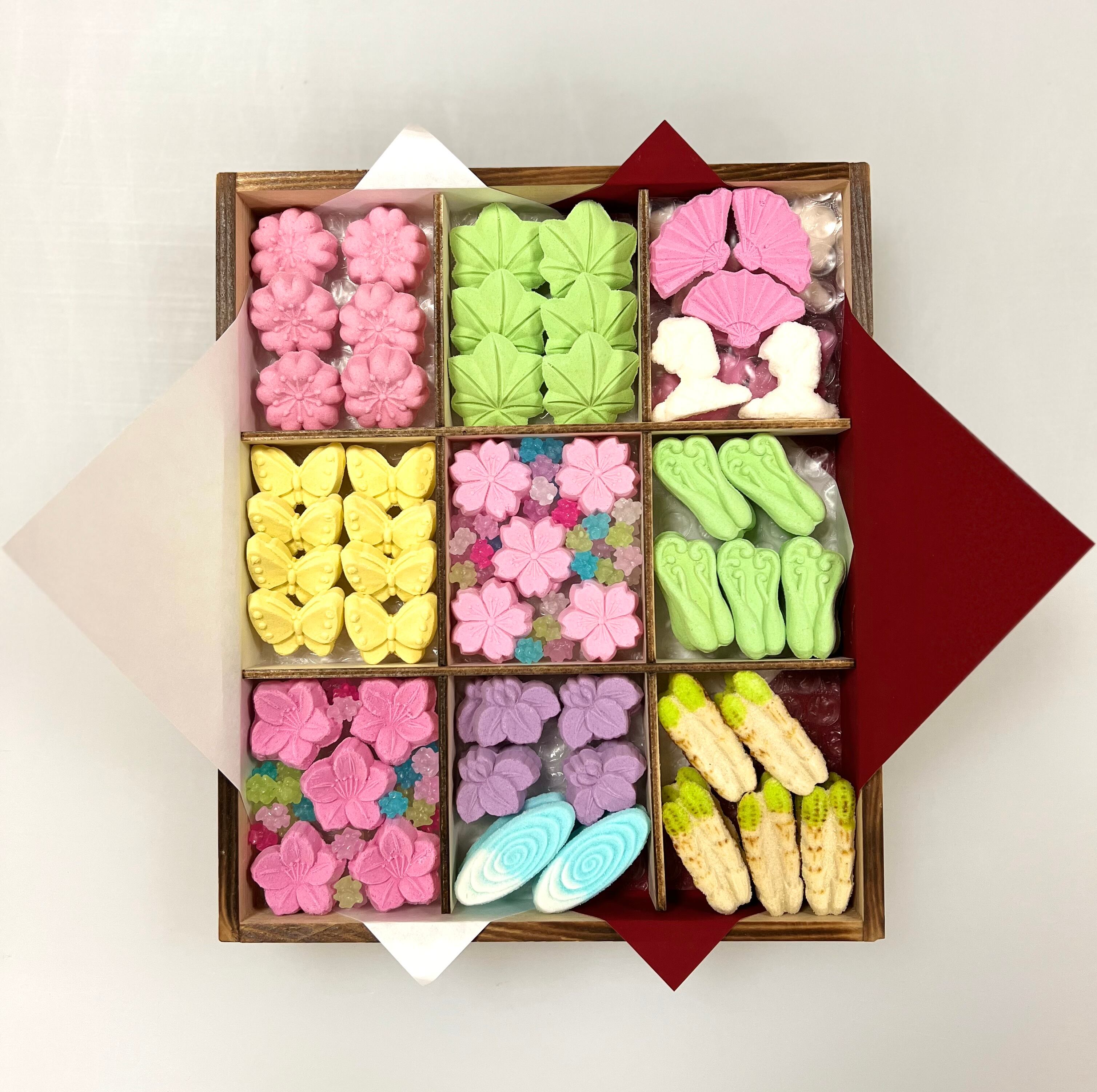 和三盆糖を使い型押しした干菓子の詰め合わせ。
