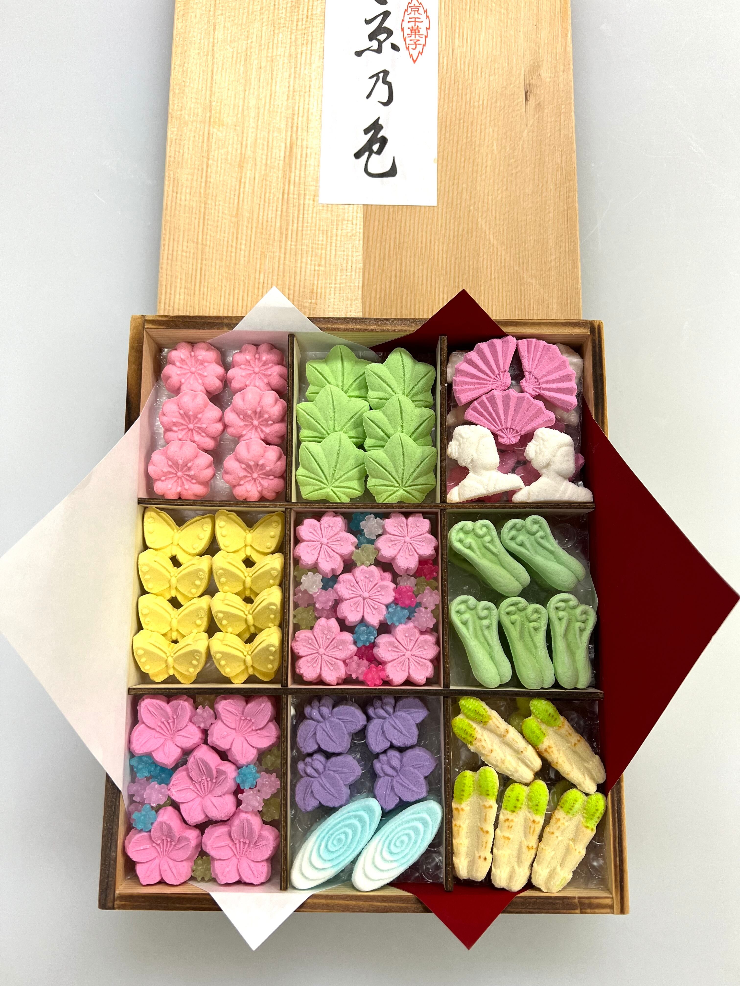 「京乃色」は春夏秋冬の季節に合わせ、内容が年4回変わり、四季折々の風情が感じとれる定番の品です。(現在の内容は写真の通り春バージョンです。)